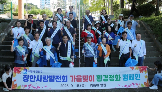 [무한뉴스=양현명 기자] 수원시 장안구의 대표 봉사단체인 장안사랑발전회는 지난 18일 영화천변 일대에서 ‘가을맞이 환경정화’ 활동을 실시했다.
