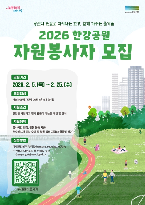[무한뉴스=정승훈 기자] 서울시 미래한강본부가 시민의 손길로 한강의 가치를 피워내고 함께 가꾸는 즐거움을 공유할 ‘2026년 한강공원 정기 자원봉사자’를 모집한다. 접수 기간은 2월 5일부터 2월 25일까지 약 3주 간이다.