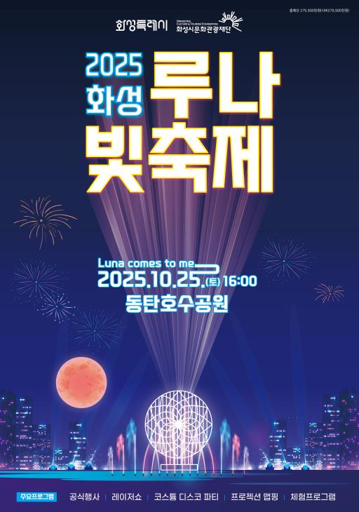 [무한뉴스=정승훈 기자] (재)화성시문화관광재단은 화성시 대표 명소인 동탄호수공원과 루나쇼를 연계한 '2025 화성 루나 빛 축제'를 오는 10월 25일 토요일 16시에 개최한다.