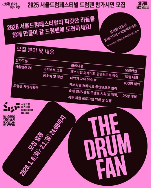 모집 및 참여에 관한 자세한 사항은 서울드럼페스티벌 누리집에서 확인할 수 있으며, 신청 접수는 2월 1일까지 누리집을 통해 받는다.