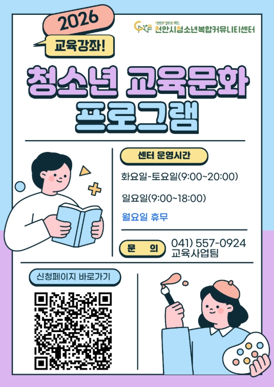 [무한뉴스=정민정 기자] (재)천안시청소년재단 천안시청소년복합커뮤니티센터가 내달부터 운영되는 ‘2026년 새 학기 교육문화 프로그램’ 수강생을 모집한다고 12일 밝혔다.