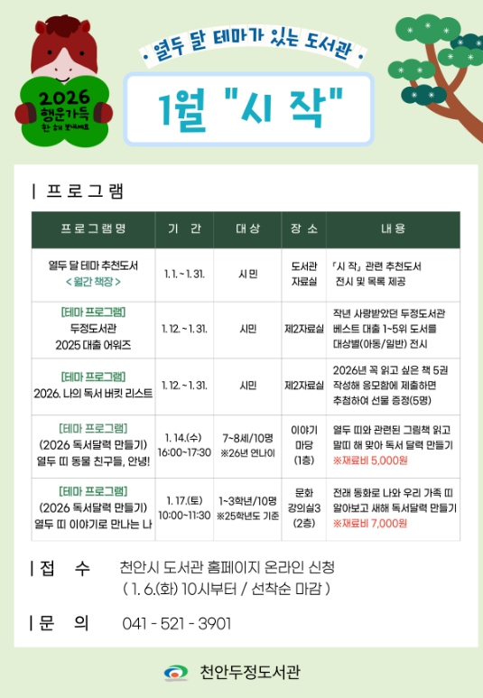 두정도서관 관계자는 “두정도서관에서 열두 달 특색있는 테마로 운영되는 프로그램을 통해 천안시민이 독서의 즐거움을 느끼고, 책과 더 가까워지는 2026년이 되길 바란다”고 말했다.