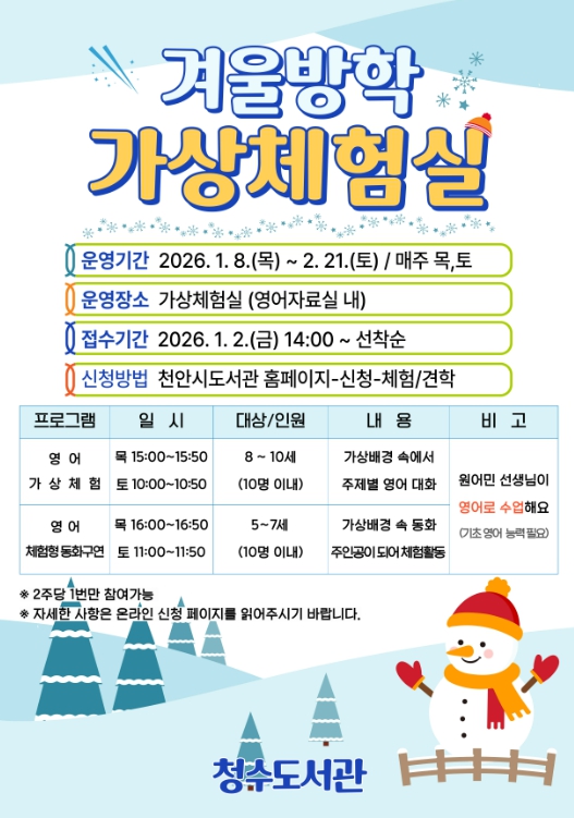사전 신청은 영어 가상체험실은 내년 1월 2일부터, 잉글리시 스토리텔링은 1월 6일부터 가능하며, 자세한 내용은 천안시도서관 누리집에서 확인할 수 있다.
