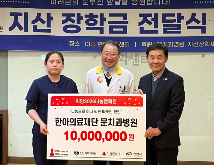 [무한뉴스=정민정 기자] (재)천안시복지재단은 지난 22일 한아의료재단 문치과병원이 학업장려금 3,000만 원을 기탁했다고 밝혔다.