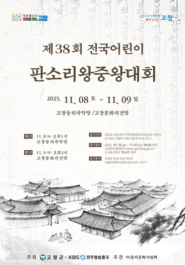 [무한뉴스=정민정 기자] 전북 고창군이 올해의 어린이 판소리 왕중왕을 가리는 ‘제38회 전국 어린이판소리왕중왕대회’ 참가자를 오는 11월7일까지 모집한다.