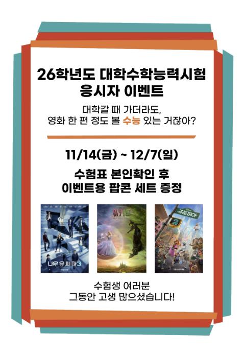 행사에서는 수험표를 지참한 수험생이 매표소에서 본인을 확인하면 팝콘 세트(미니팝콘, 탄산음료)가 제공된다.