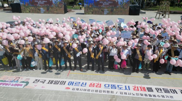 [무한뉴스=정민정 기자] 김제시는 김제시어르신섬김위원회가 제27회 김제지평선축제를 맞아 지난 10일, 노인맞춤돌봄서비스 수행기관 3개소(김제노인복지센터, 김제노인종합복지관, 성암노인복지센터) 250여명의 종사자들과 함께‘어르신이 행복한 도시 김제’를 만들어가기 위한 캠페인을 진행했다고 밝혔다.