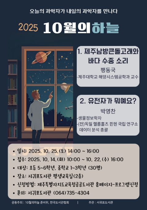[무한뉴스=정민정 기자] 제주도교육청 서귀포도서관은 25일 오후 2시부터 서귀포도서관 평생교육실에서 한국도서관협회 및 ‘10월의 하늘’ 준비위원회와 함께 ‘10월의 하늘’ 프로그램을 운영한다.