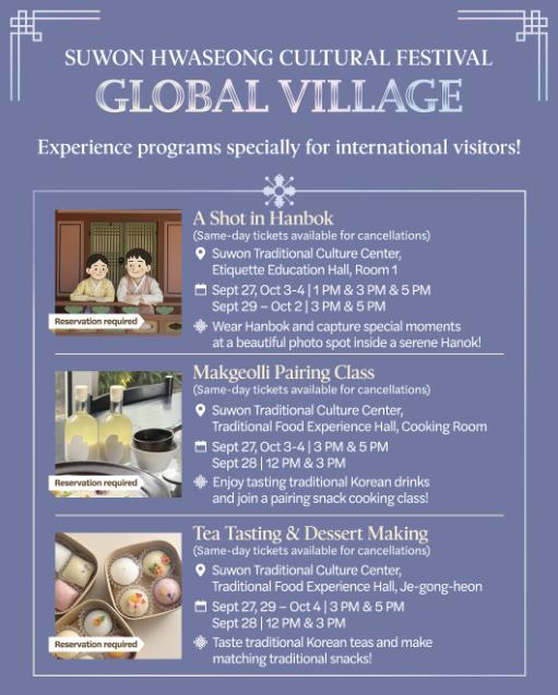 ‘글로벌 빌리지’는 세계 각국에서 온 방문객들이 한국 전통문화를 쉽고 깊이 있게 체험할 수 있도록 마련된 공간으로, ▲한복 체험‘한복한컷’ ▲행궁티룸 ‘다랑다랑’▲우리술 클래스‘주랑주랑’ ▲한옥놀이터 마당플 등 다채로운 프로그램이 운영된다.