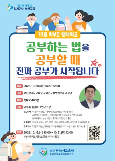 [무한뉴스=정승훈 기자] 부산광역시교육청은 학부모의 올바른 자녀 교육관 정립 및 부산교육 정책 이해를 돕기 위해 ‘10월 학부모 행복학교’를 운영한다고 밝혔다.