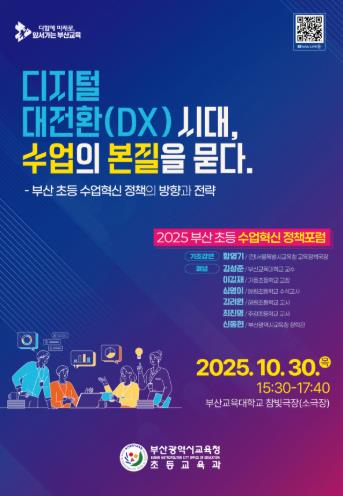 [무한뉴스=정승훈 기자] 부산광역시교육청은 오는 30일 오후 부산교육대학교 참빛극장에서 초등 교원과 교육전문직원 등 200여 명을 대상으로 ‘디지털 대전환(DX)* 시대, 수업의 본질을 묻다’를 슬로건으로 ‘2025 부산 초등 수업혁신 정책포럼’을 개최한다고 밝혔다.