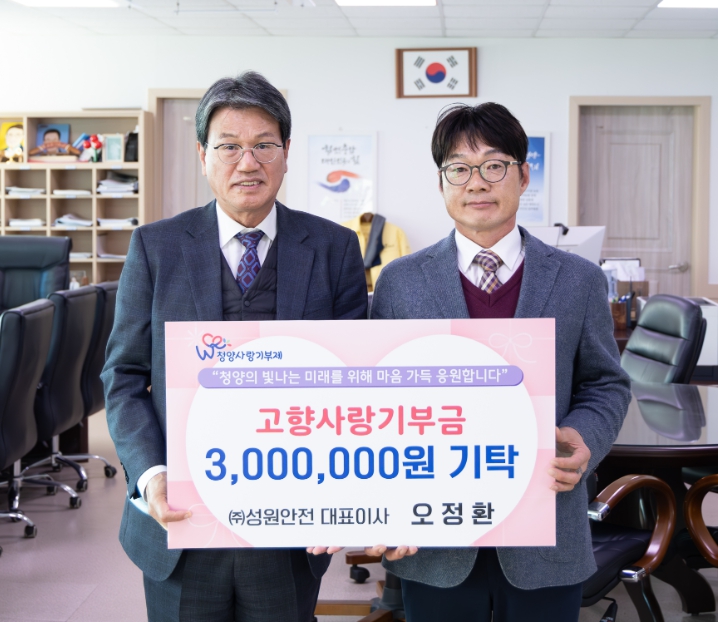 [무한뉴스=정민정 기자] 청양군은 24일 ㈜성원안전(대표 오정환)이 고향사랑기부금 300만 원을 기탁했다고 밝혔다.