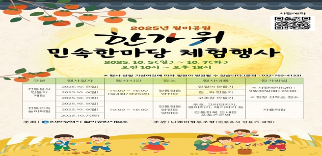 [무한뉴스=정승훈 기자] 인천광역시 월미공원사업소는 오는 10월 5일부터 7일까지 3일간 월미공원 내 전통정원(양진당)에서 ‘한가위 민속한마당 체험행사’를개최한다고 밝혔다.