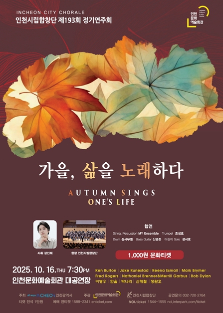 [무한뉴스=정승훈 기자] 인천시립합창단(예술감독 윤의중)은 오는 10월 16일 오후 7시 30분, 인천문화예술회관 대공연장에서 깊어지는 가을의 정취와 함께 삶의 울림과 희망을 담은 무대를 선보인다.