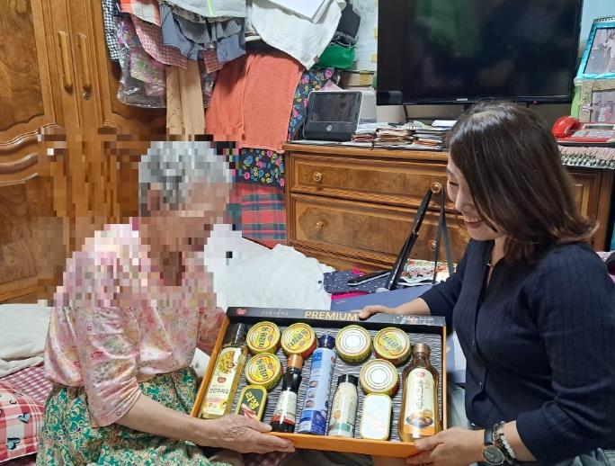 | ▲ 방문 간호사가 건강 취약계층을 방문해 추석 명절맞이 후원물품을 전달하고 있다 |