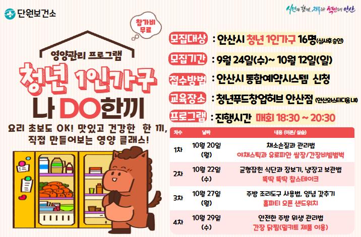 [무한뉴스=정승훈 기자] 안산시 단원보건소는 오는 24일부터 청년 1인가구 영양관리 프로그램 ‘나DO한끼’ 참여자를 모집한다고 23일 밝혔다.