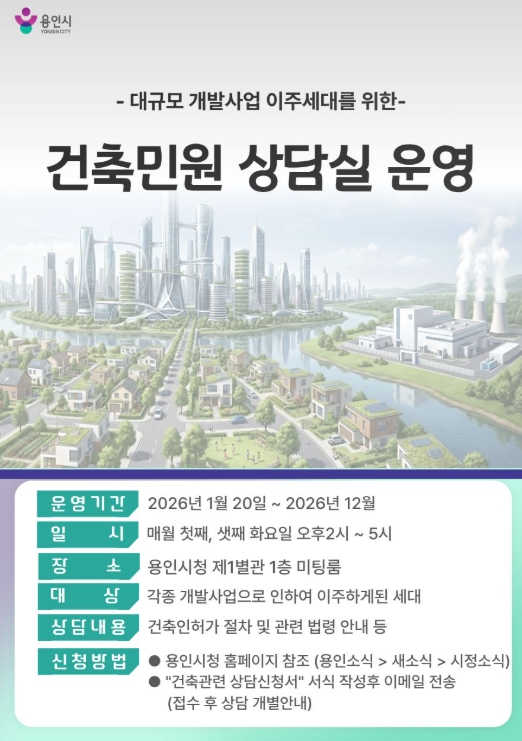 시 관계자는 “개발사업으로 이주하는 시민들이 건축 절차에 대한 정보 부족으로 어려움을 겪는 경우가 많다”며 “건축민원 상담실 운영을 통해 시민 불편을 줄이고, 보다 체계적인 행정 지원이 이뤄질 수 있도록 지원할 것”이라고 말했다.