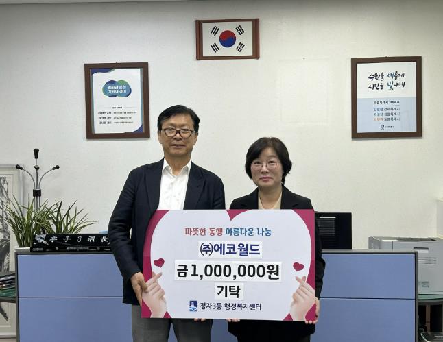 | ▲ 수원시 장안구 정자3동, ㈜에코월드로부터 추석 이웃돕기 성금 전달 받아 |