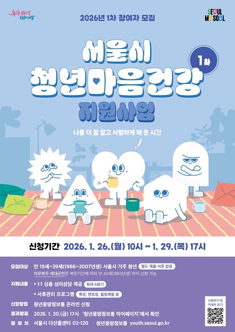 업그레이드된 ‘2026년 서울 청년 마음건강 지원사업’ 참여자 모집은 오는 26일 1차 2,500명을 시작으로 총 4회에 걸쳐 진행된다. 1차 신청 기간은 1월 26일 오전 10시부터 29일 17시까지다. 우울, 불안 등 정서적으로 어려움을 겪고 있는 서울 거주 19~39세 청년이면 누구나 청년몽땅정보통에서 신청할 수 있다.