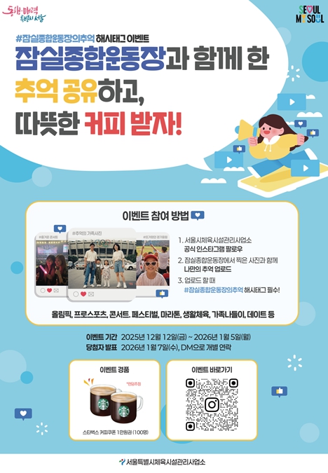 [무한뉴스=정승훈 기자] 서울시 체육시설관리사업소는 잠실종합운동장에서 시민이 경험한 다양한 추억과 기억을 수집하기 위한 SNS 이벤트 '#잠실종합운동장의 추억 해시태그 이벤트'를 2026년 1월 5일까지 진행한다고 밝혔다.