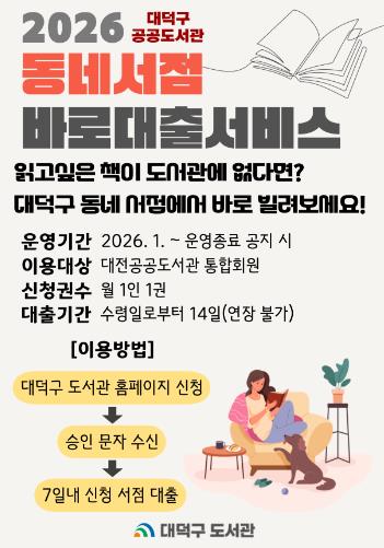 이용 대상은 대전공공도서관 통합회원이면 누구나 가능하며, 신청은 대덕구 도서관 홈페이지 ‘나의 서재 – 동네서점 바로대출’ 메뉴를 통해 가능하다.