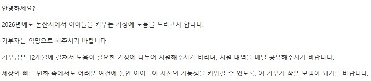 백성현 논산시장은 “매년 이어지는 고액 기부에 다시 한번 감사드린다”며 “기부자님이 강조한 우분투 정신은 우리 모두가 어려운 시대를 살아가는 기본 마음가짐”이라고 말했다. 이어 “시에서도 어려운 이웃을 더욱 세심하게 살피고 지원하는 데 최선을 다하겠다”고 말했다.