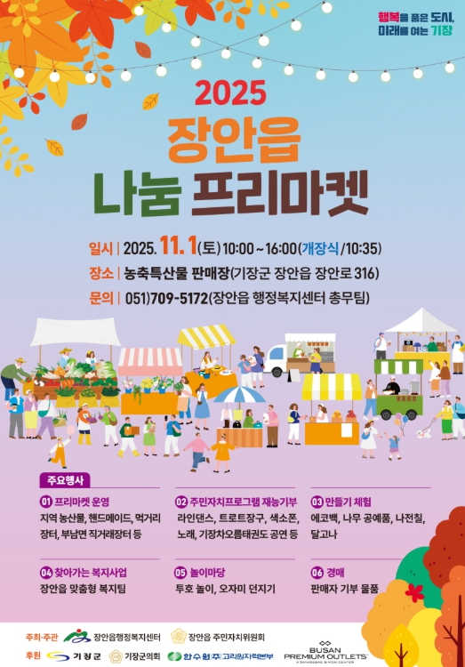 [무한뉴스=최진수 기자] 기장군 장안읍은 풍요로운 가을을 맞아 오는 11월 1일(토) 농축특산물 판매장(장안읍 장안로 316)에서 장안읍 주민자치위원회 주관으로 자연과 문화가 함께하는 2025년 ‘장안읍 나눔 프리마켓’을 개최한다고 31일 밝혔다.