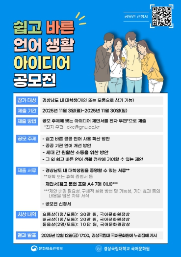 이번 공모전은, 경상남도 내 대학생을 대상으로 올바른 언어문화 확산에 기여할 수 있는 실용적·창의적인 아이디어를 발굴하고자 마련했다. 공모 주제는 ▲쉽고 바른 공공언어 사용 확산 방안 ▲공공기관 언어 개선 방안 ▲세대 간 원활한 소통을 위한 방안 등으로, 일상과 공공 영역에서 누구나 이해하기 쉬운 언어환경을 조성할 다양한 제안을 제출하면 된다.