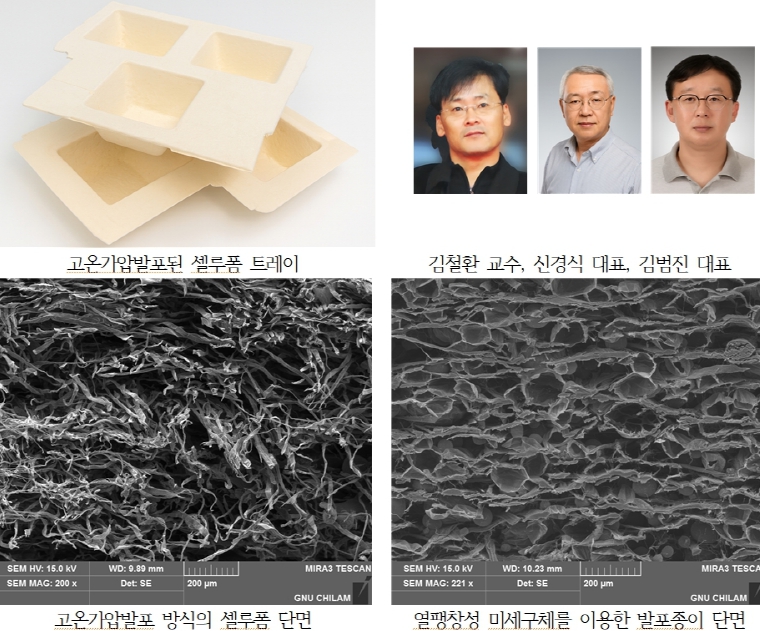 [무한뉴스=최진수 기자] 경상국립대학교 농업생명과학대 환경재료과학과 김철환 교수 연구팀은 셀룰로오스 섬유, 전분, 열팽창성 미세구체, 계면활성제 등을 조합해 고온가압발포 방식으로 제조하는 친환경 발포 포장재 ‘셀루폼(Cellufoam)’ 개발에 성공했다.