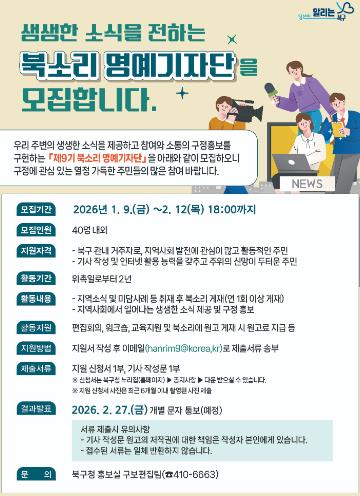북구는 명예기자단의 원활한 활동을 위해 편집회의, 워크숍, 교육 등을 지원하고 원고가 채택될 경우 소정의 원고료를 지급할 계획이다.