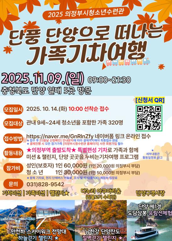 이번 행사는 단풍철 성수기를 맞아 의정부역에서 단양역까지 왕복 특별 기차편을 마련했으며, 도담삼봉·단양잔도·만천하 스카이워크 전망대·다누리 아쿠아리움·구경시장 등 단양의 대표 명소를 탐방한다. 참가 가족은 두 팀으로 나뉘어 순환형 일정으로 운영되며, 현장에서 미션 · 챌린지 활동이 함께 진행되어 여행의 재미를 더할 예정이다.
