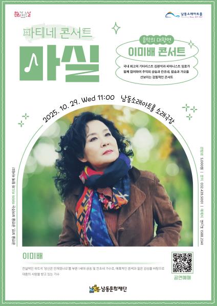[무한뉴스=정승훈 기자] 인천시 남동구 남동문화재단은 남동소래아트홀의 대표 상설 프로그램인 ‘마티네콘서트 마실’로 ‘이미배 콘서트’를 10월 29일 개최한다고 10일 전했다.