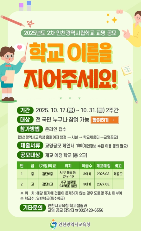 인천광역시교육청 관계자는 “교명 선정 과정에서 법적 절차를 준수하고, 학생·학부모·지역사회가 의견을 개진할 수 있도록 참여 기회를 확대하겠다”고 말했다.