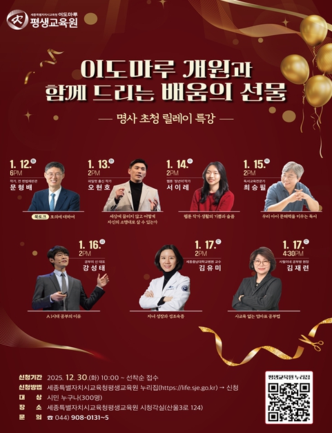 [무한뉴스=정민정 기자] 세종특별자치시교육청평생교육원(원장 송정순)은 2026년 1월 개원을 기념해 1월 12일부터 17일까지 6일간 개원 주간을 운영하고, 개원 행사의 일환으로 ‘명사 초청 릴레이 특강’을 매일 개최한다.