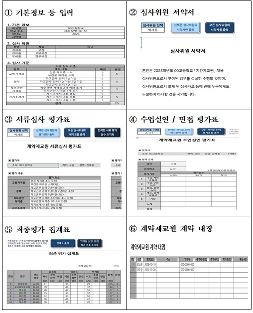 두 번째 성과는 계약제 교원 채용 자동화 프로그램 제작이다. 이 프로그램은 학교 현장에서 반복적으로 이루어지는 단기간 계약제 교원 채용 업무를 자동화하여, 복잡한 행정 절차를 간소화할 수 있도록 지원하는 것을 목표로 하고 있다.