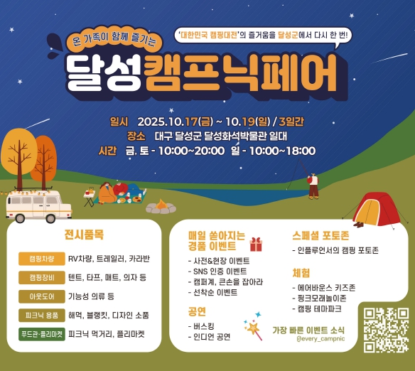 [무한뉴스=최진수 기자] 달성군은 오는 17일부터 19일까지 달성화석박물관 앞 광장에서 캠핑용품 전시·판매와 캠핑 문화를 체험할 수 있는 ‘달성캠프닉페어’를 개최한다고 밝혔다.