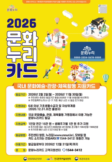 한편, 문화누리카드 발급 및 이용처 관련 자세한 사항은 거주지 읍·면·동 행정복지센터, 문화누리카드 누리집 및 고객센터 등을 통해 안내받을 수 있다.
