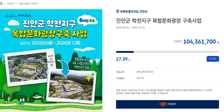 [무한뉴스=정민정 기자] 진안군이 고향사랑기부제 지정기부사업으로 지난 6월부터 추진 중인 “학천지구 복합문화광장 구축사업”이 모금 시작 6개월 만에 누적 모금액 1억 원을 달성했다.