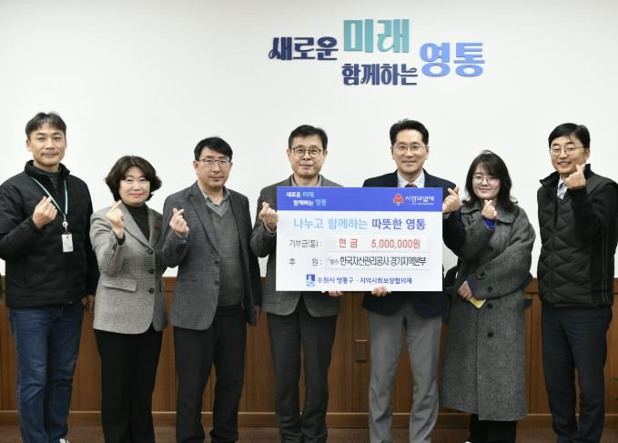[무한뉴스=양현명 기자] 수원시 영통구는 지난 24일 한국자산관리공사 경기지역본부에서 관내 경제적으로 어려움을 겪는 이웃을 위해 성금 500만 원을 기부했다고 밝혔다.