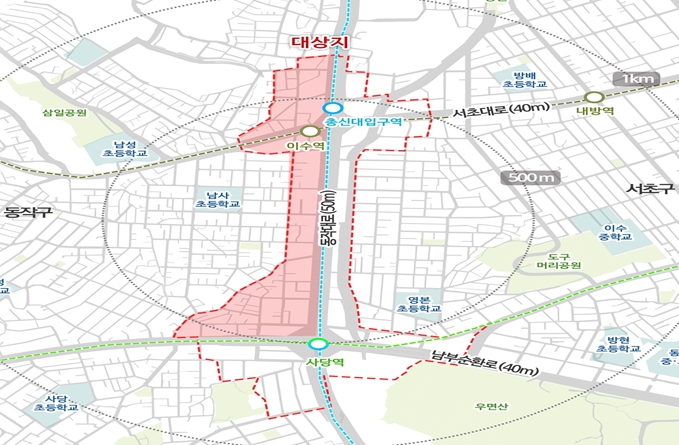 대상지는 지하철 이수역(4·7호선)에서 사당역(2·4호선)까지 이어지는 동작대로 일대로, 동서로는 서리풀터널 개통과 옛 정보사 부지 개발이 추진되고 있으며 남북으로는 이수~과천 복합터널 민간투자사업이 계획되고 있어 사당·이수역 일대의 위상과 기능이 강화되고 있는 지역이다.