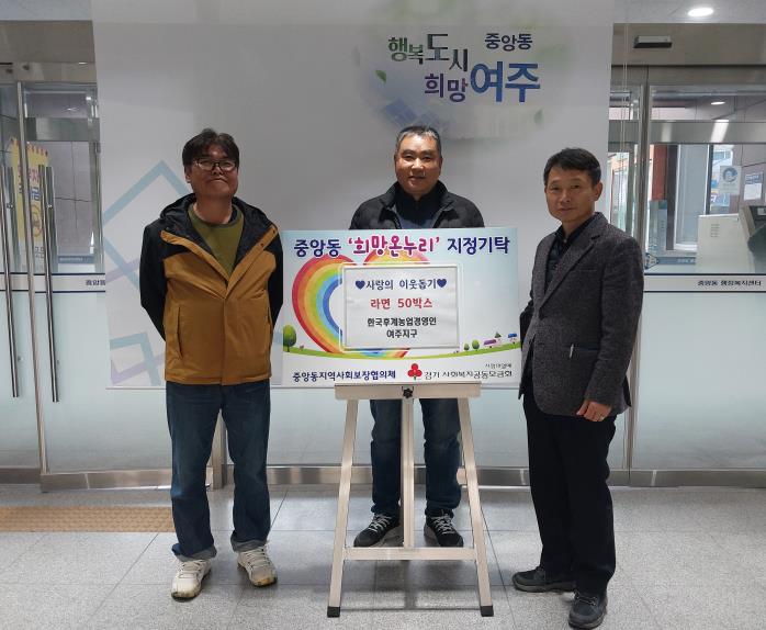 [무한뉴스=정충근 기자] 여주시 중앙동 소재 한국후계농업경영인 여주지구은 지난 24일 동 행정복지센터를 방문해 관내 저소득 취약계층을 위한 라면 50박스를 기탁했다.