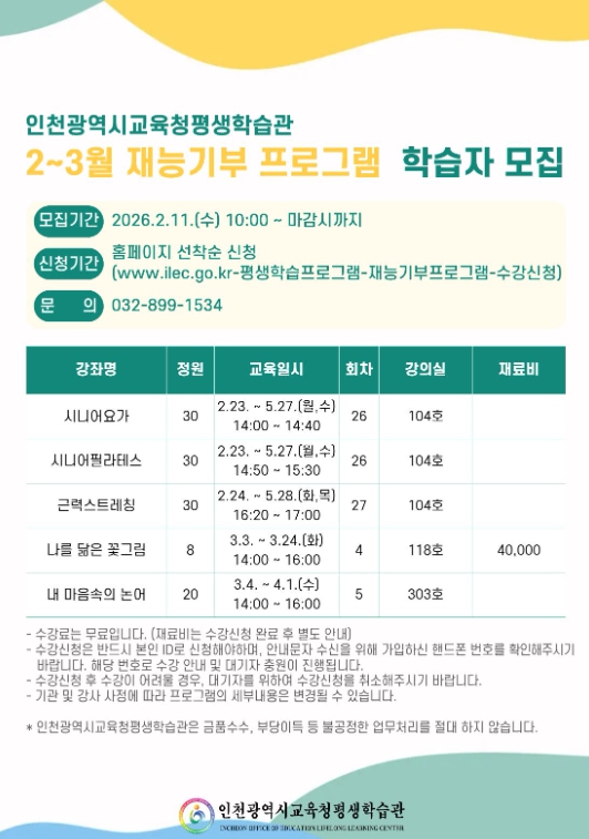 [무한뉴스=정승훈 기자] 인천광역시교육청평생학습관은 오는 23일부터 ‘재능기부 프로그램’을 운영한다.