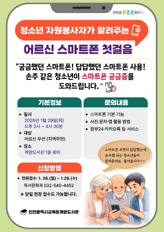 [무한뉴스=정승훈 기자] 인천광역시교육청계양도서관은 오는 29일 1층 로비에서 ‘어르신 스마트폰 첫걸음’행사를 운영한다.
