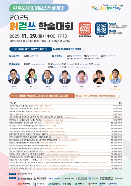 [무한뉴스=정승훈 기자] 인천광역시교육청은 11월 29일 경인교육대학교에서‘AI 주도시대, 읽걷쓰가 답이다!’를 주제로 급변하는 AI 중심 사회에서 읽걷쓰 교육의 중요성과 적용 사례를 조명하는‘2025 읽걷쓰 학술대회’를 개최한다.