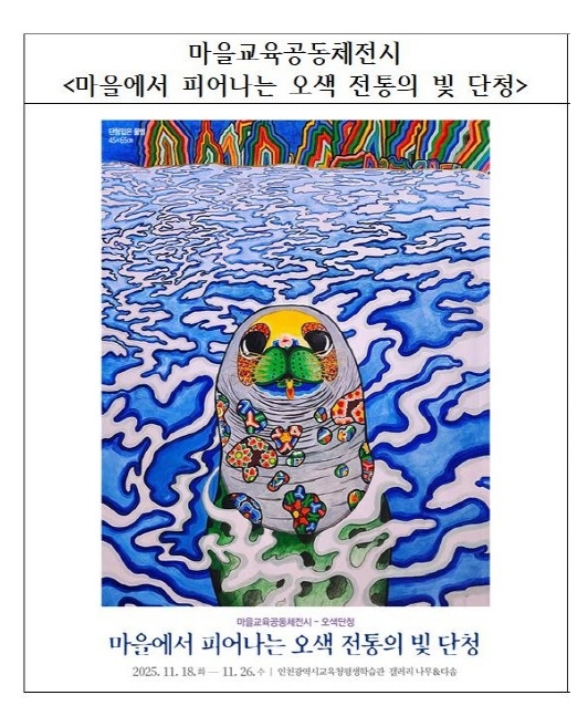 [무한뉴스=정승훈 기자] 인천광역시교육청평생학습관은 11월 18일부터 26일까지 평생학습관 2층 갤러리 나무와 다솜에서 ‘마을에서 피어나는 오색 전통의 빛 단청’ 전시를 개최한다.