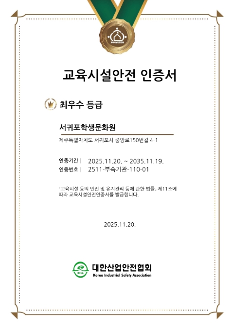 [무한뉴스=정승훈 기자] 제주도교육청 서귀포학생문화원은 (사)대한산업안전협회가 실시한 교육시설 안전 인증 심사에서 최우수 및 우수 등급을 받았다고 8일 밝혔다.