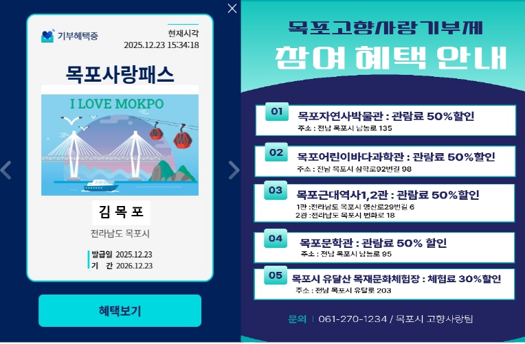 ‘목포사랑패스’는 목포시에 10만 원 이상 고향사랑기부를 하면 자동으로 발급되며, 고향사랑e음 누리집 마이페이지에서 확인할 수 있다.
