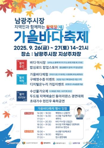 [무한뉴스=정민정 기자] 광주 동구는 오는 26~27일 이틀간 남광주시장 공영주차장 일원에서 ‘활력장! 가을 바다 축제’를 개최한다고 밝혔다.