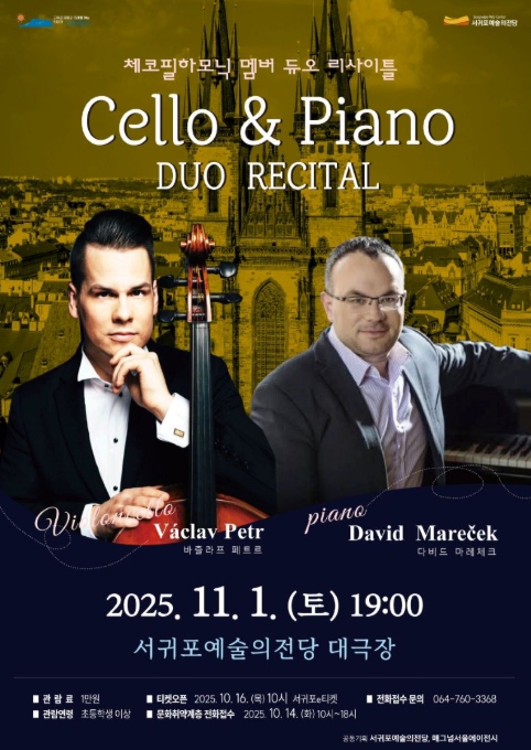 [무한뉴스=정민정 기자] 서귀포시는 11월 1일 오후 7시, 서귀포예술의전당 대극장에서 체코필하모닉오케스트라 멤버 '첼로 & 피아노 듀오 리사이틀'을 개최한다고 밝혔다.
