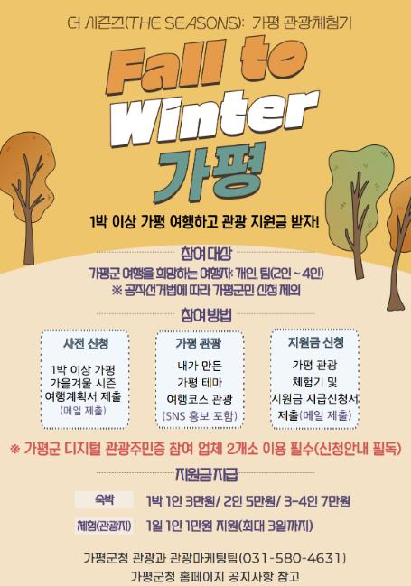 ‘더 시즌즈’는 가평군의 대표적인 체류형 관광 프로그램으로, 봄과 여름 시즌에 이어 올해 세 번째로 추진한다. 이번 가평 관광 체험기 ‘더 시즌즈’ '폴 투 윈터(Fall to Winter) 가평'편은 참가자들이 가평의 가을·겨울 관광코스를 직접 구성해 여행하고, 그 경험을 사회관계망서비스(SNS) 등 온라인 콘텐츠로 공유하는 참여형 프로그램이다.